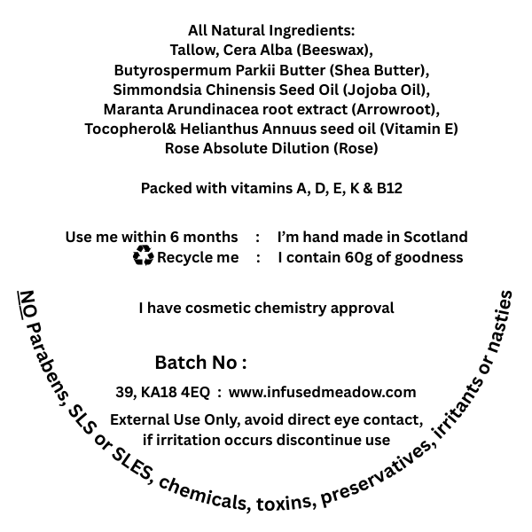 Contains Beef Tallow, Beeswax, Shea Butter, Jojoba Oil, arrowroot powder, vitamin E and Rose essential oil